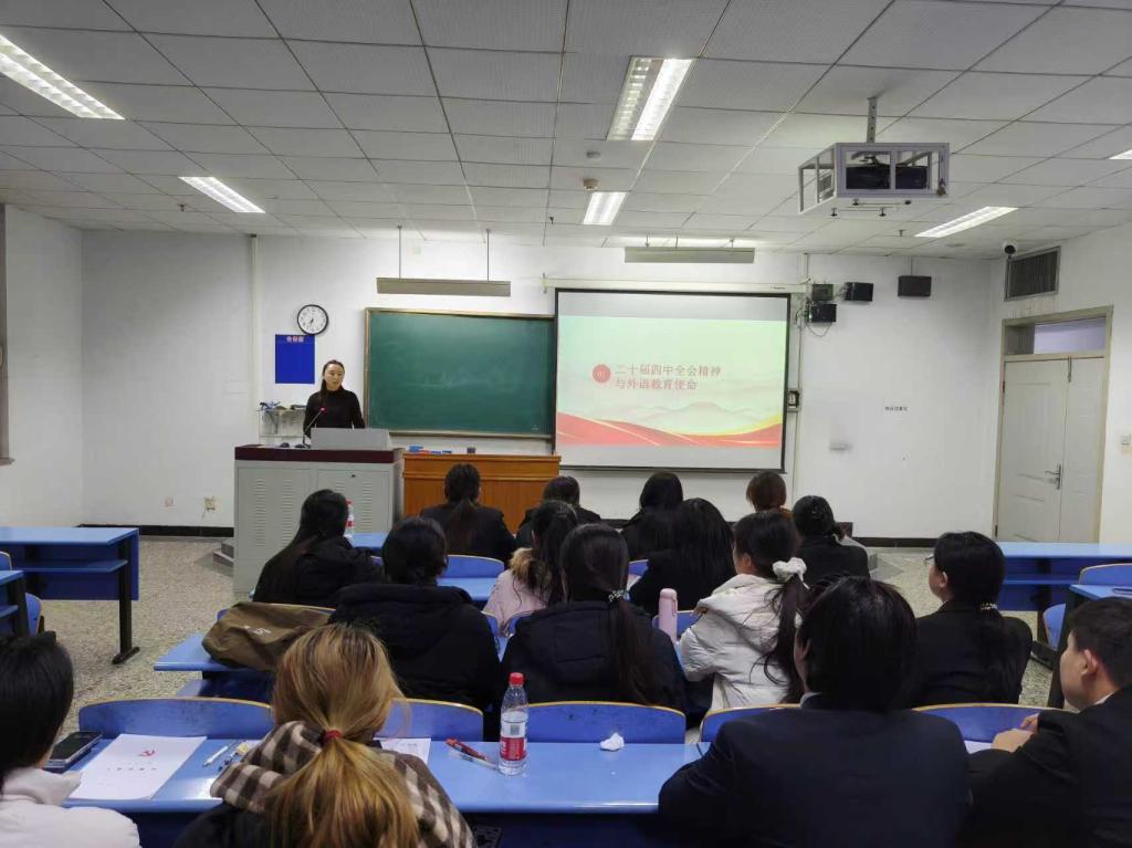 为深入学习宣传贯彻党的二十届四中全会精神及习近平总书记在全会上的重要讲话精神,切实把全体师生的思想和行动统一到全会精神上来,近日,bbin连环夺宝官网党总支副书记曹丽君面向全体学生开展“深学全会精神 笃行强师之路”主题宣讲,为外院学子解读全会精神核心要义,指引专业成长与职业发展方向。