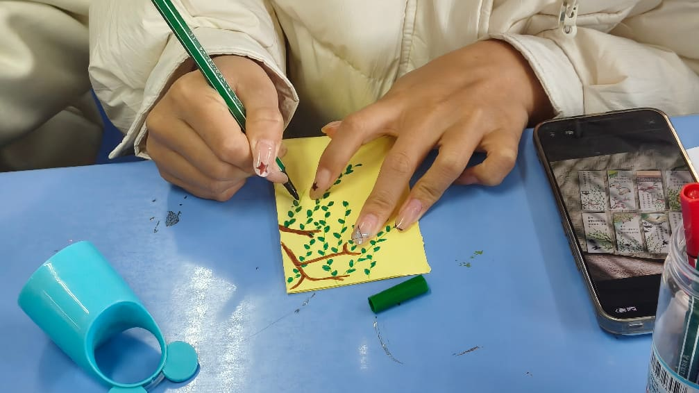 创作进程充满宁静与暖意。同学们在专注创作中暂时忘却学业烦恼,在安静的氛围里沉淀心绪,原本陌生的同学也因交流创作技巧而熟络起来。同学们在构思与创作中,不仅锻炼了动手能力与审美素养,更在享受手工带来的治愈与联结。